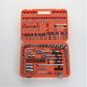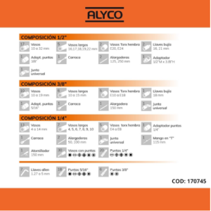 – Composição 1/4”: 13 soquetes (4 a 14 mm) / 7 soquetes série longa (4 a 10 mm) / 1 catraca reversível com ejetor de 72 dentes / 2 extensões (50, 100 mm) / 1 chave de fendas de 150 mm / 1 cabo em “T” de 115 mm / 1 junta universal / 20 pontas de 1/4″ (plana, PH, PZ, Torx, Robertson) / 30 soquetes com ponta (Plana, PH, PZ, Torx, Torx inviolável, sextavada)/ 5 soquetes Torx fêmea (E4 a E8).